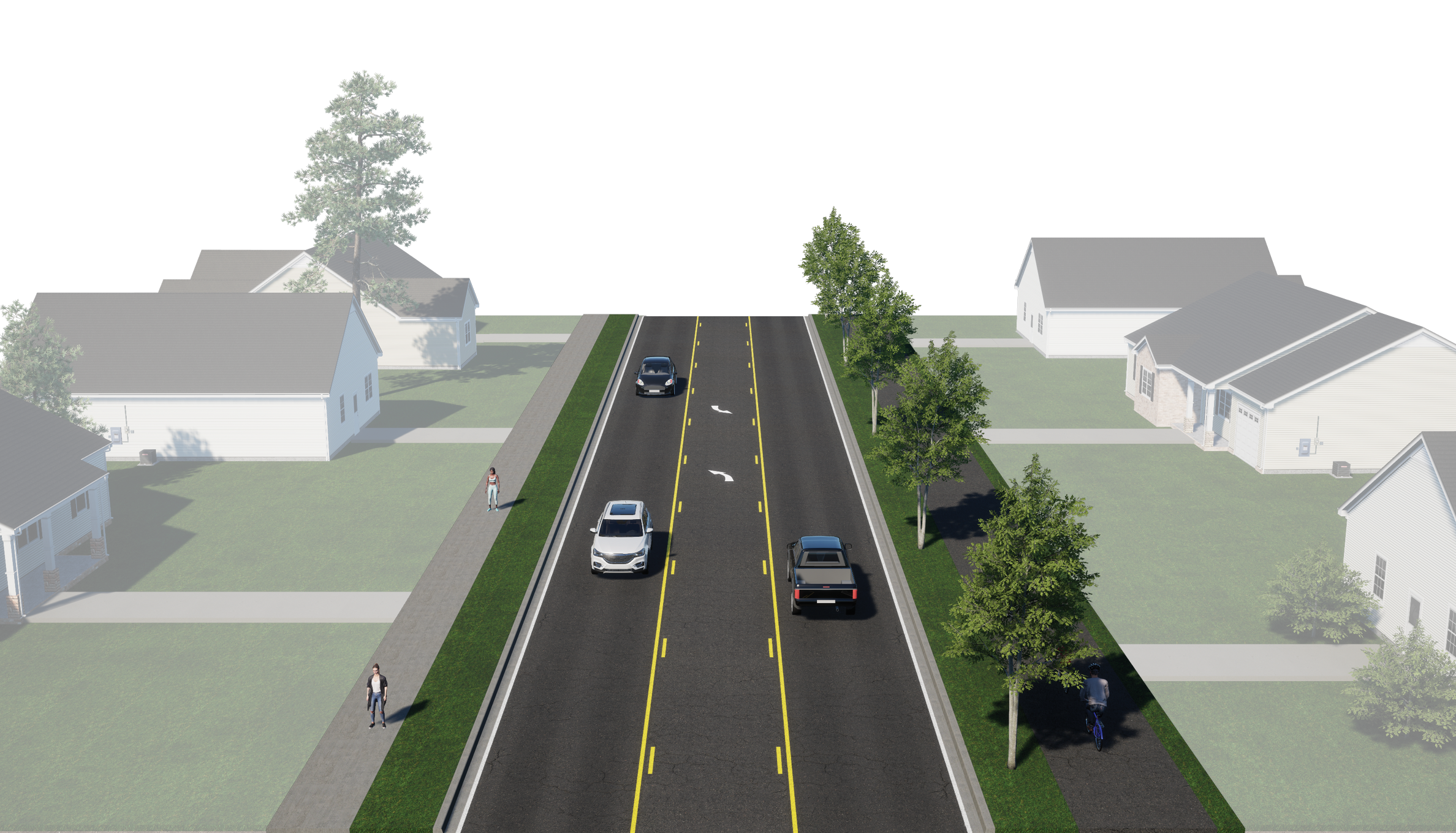 The design concept for Nicollet Avenue (shown above looking north) includes one travel lane in each direction with a center lane for turning, with a sidewalk on the west side and a shared use path on the east side.This design offers: