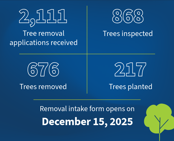 The tree removal and replacement program is accepting applications on Thursday, November 20 from 7 a.m. to 7 p.m. A random lottery will be used to select 100 tree removals for this round out of the applications received. Notifications of application status will be sent via email on Monday, November 24.